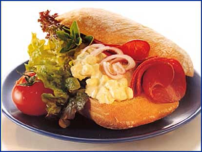 Dela bröden och fyll med acapulcocurry och rökt strutsstek. Dekorera med grönsallad och tunt skivad rödlök. | ||||||||||