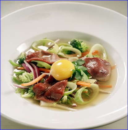 Koka upp buljongen enligt beskrivning: Bryn benen och köttet med grönsakerna i ugn. Häll över vattnet och låt sjuda i ca 4-5 timmar. Skumma väl och ta bort allt fett. Sila av buljongen och låt kallna. Mal 250 gr renkött och blanda med 3-4 uppvispade äggvitor. Häll över buljongen och låt det långsamt sjuda upp och koka därefter försiktigt ett par minuter. Lägg på ett lock och dra av kastrullen från spisen och låt buljongen vila i 10 minuter. Silas genom silduk. Lägg i grönsakerna och låt koka upp. Salta och peppra. Skär köttet halvfruset i lövtunna skivor. Häll upp den heta soppan i en djuptallrik och lägg i köttbitarna. Servera med rå äggula och gärna lite wasabi. Tips. För storkök användes buljong på tärning eller flytande buljong på flaska, frysta strimlade grönsaker och Polaricas Viltmästarskav. Recept skapat för Polarica av Sten A Öhman, viltmästare och kökschef vid Görvälns Slott i Järfälla. |
