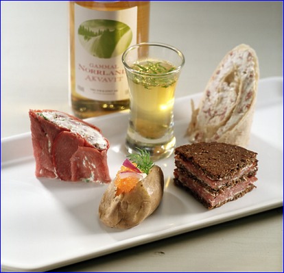 Smöra tunna skivor kavring. Varva kavringsskivor med rensalami till önskad höjd. Linda om kavringsskivorna med smörpapper och en fuktig handuk. Lägg alltsammans i press. Skär i portionsbitar. Hacka rödlök, persilja och blanda med färskost, typ Cantandou. Lägg plastfolie i en avlång oval form och täck med tunna skivor rökt renstek. Fyll upp formen med ca 2 cm av ostblandningen. Vik över rensteken och linda in i plasten. Skär i skivor. Blanda pepparotsost, hackad rökt renstek och bred ut på mjukt tunnbröd. Rulla ihop som tunnbrödet. Skär diagonala skivor. Baka mandelpotatis på grovt salt i ugn, 175 C, i ca 30 minuter. Skär ett kryss i potatisen och tryck lätt på kortsidorna. Fyll potatisen med en blandning av creme fraiche, rödlök och löjrom. Renshot: Koka upp renbuljong enligt beskrivning: Bryn benen och köttet med grönsakerna i ugn. Häll över vattnet och låt sjuda i ca 4-5 timmar. Skumma väl och ta bort allt fett. Sila av buljongen och låt kallna. Mal 250 gr renkött och blanda med 3-4 uppvispade äggvitor. Häll över buljongen och låt det långsamt sjuda upp och koka därefter försiktigt ett par minuter. Lägg på ett lock och dra av kastrullen från spisen och låt buljongen vila i 10 minuter. Silas genom silduk. Serveras som varm shot spetsad med Norrlands akvavit och strimlad libbsticka. Recept skapat för Polarica av Sten A Öhman, viltmästare och kökschef vid Görvälns Slott i Järfälla. |